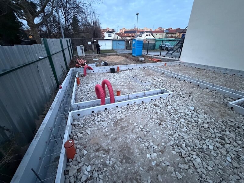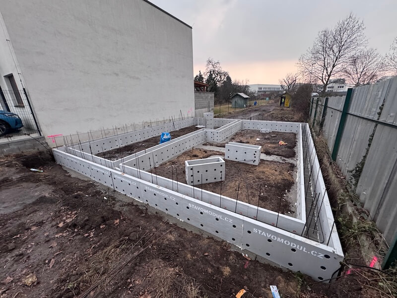 V březnu 2026 jsme dodali základové tvarovky pro projekt v Brně, kde realizační firma řešila vyšší základy – celkem 1 100 mm. Konstrukce byla rozdělena do dvou navazujících stupňů o výškách 600 mm a 500 mm. Díky použití polystyrénového ztraceného bednění zvládla stavební firma celý proces – od uložení tvarovek přes přesun hmot, montáž výztuží až po betonáž – během 3 pracovních dnů. Hlavním benefitem byla v tomto případě rychlost výstavby – klasického řešení přes betonové ztracené bednění by bylo výrazně časově delší, pracnější a tím i dražší – konkrétněji se dočtete v Porovnání základových tvarovek a betonového ztraceného bednění.
