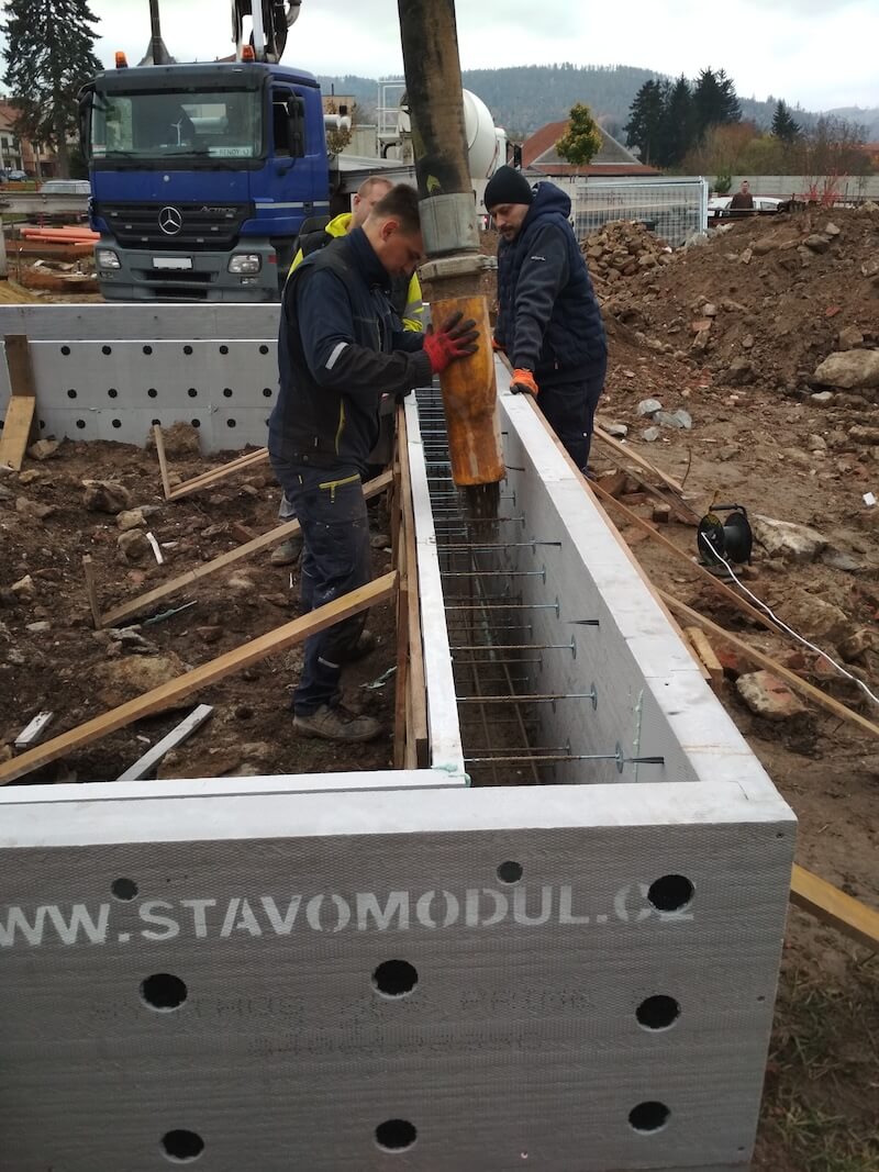Na fotkách níže je vidět také betonování – tvarovky jsou vzájemně spojeny speciálními třmeny – ocelovými pozinkovanými tyčemi s podložkami a maticemi.